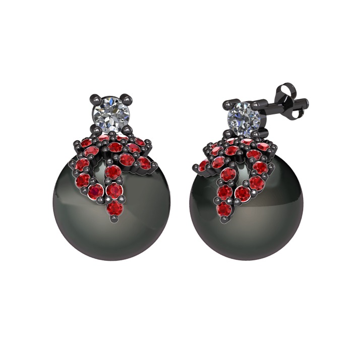 Pırlanta, garnet ve siyah inci 925 ayar siyah rodyum kaplama gümüş küpe (0.22 karat)