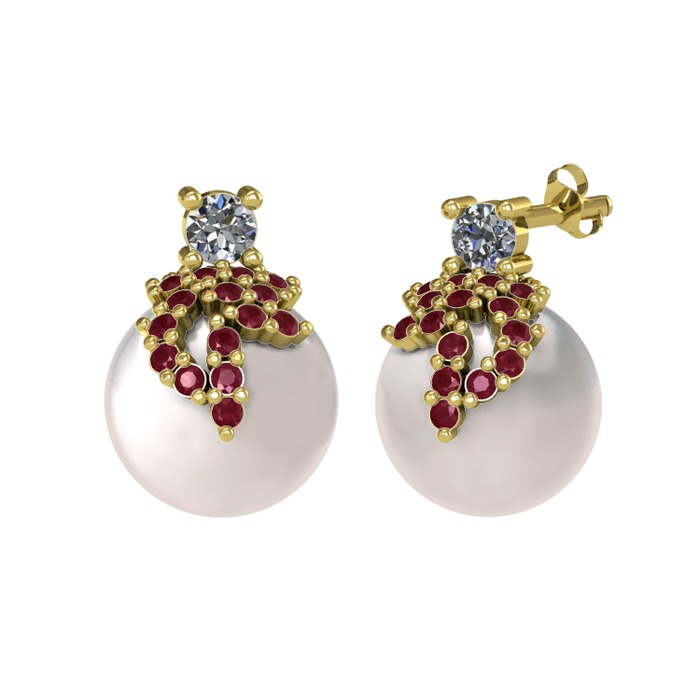 Pırlanta, kök yakut ve inci 18 ayar altın küpe (0.22 karat)