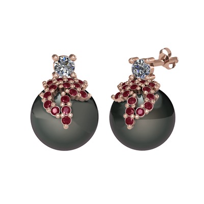 Pırlanta, kök yakut ve siyah inci 8 ayar rose altın küpe (0.22 karat)