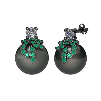 Pırlanta, kök zümrüt ve siyah inci 925 ayar siyah rodyum kaplama gümüş küpe (0.22 karat)