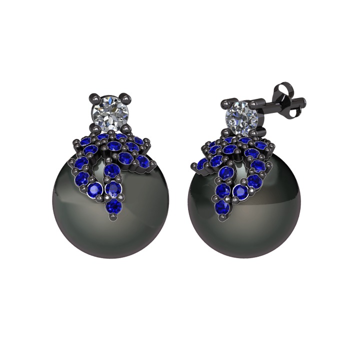 Pırlanta, lab safir ve siyah inci 925 ayar siyah rodyum kaplama gümüş küpe (0.22 karat)
