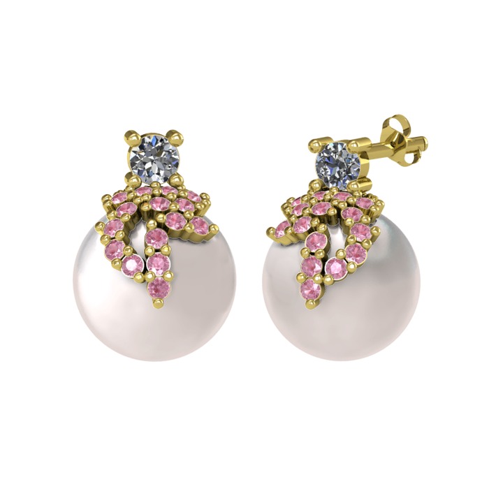 Pırlanta, pembe kuvars ve inci 925 ayar altın kaplama gümüş küpe (0.22 karat)