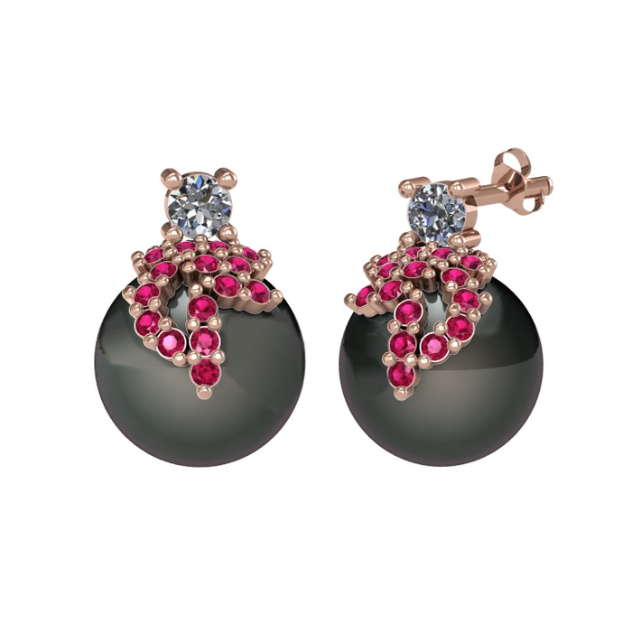 Pırlanta, rodolit garnet ve siyah inci 14 ayar rose altın küpe (0.22 karat)