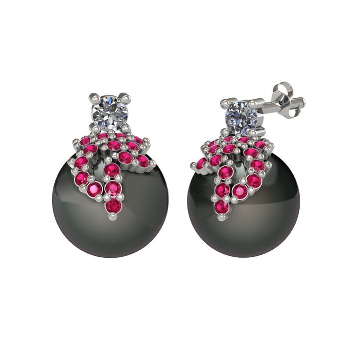 Pırlanta, rodolit garnet ve siyah inci 18 ayar beyaz altın küpe (0.22 karat)