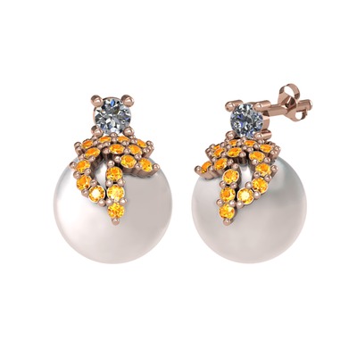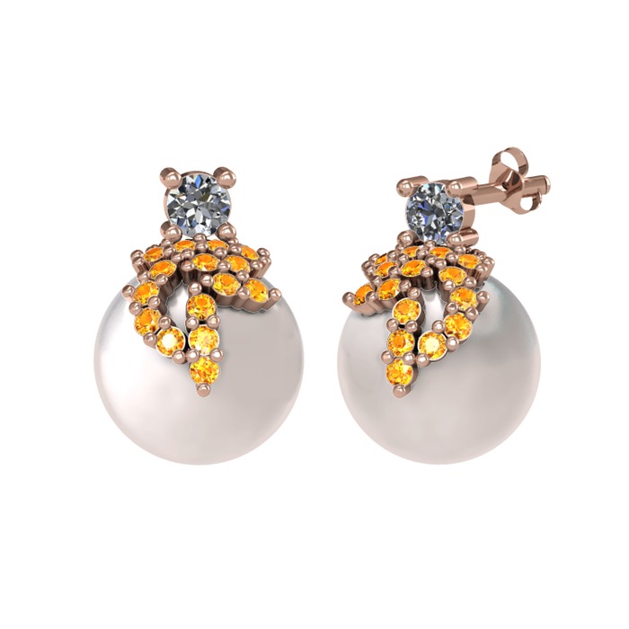 Pırlanta, sitrin ve inci 8 ayar rose altın küpe (0.22 karat)