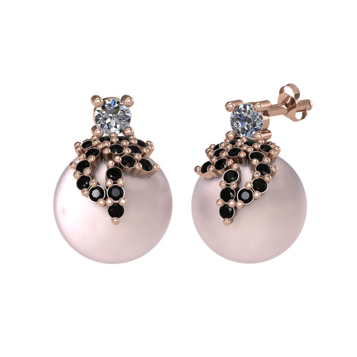 Pırlanta, siyah zirkon ve pembe inci 8 ayar rose altın küpe (0.22 karat)