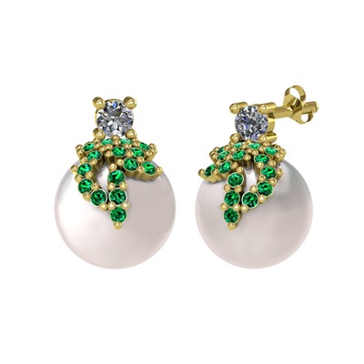 Pırlanta, yeşil kuvars ve inci 14 ayar altın küpe (0.22 karat)
