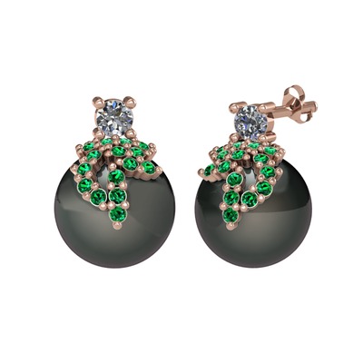 Pırlanta, yeşil kuvars ve siyah inci 14 ayar rose altın küpe (0.22 karat)