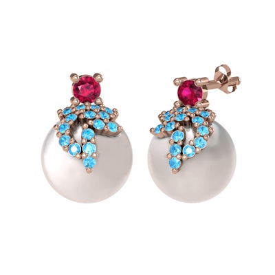Rodolit garnet, akuamarin ve inci 18 ayar rose altın küpe