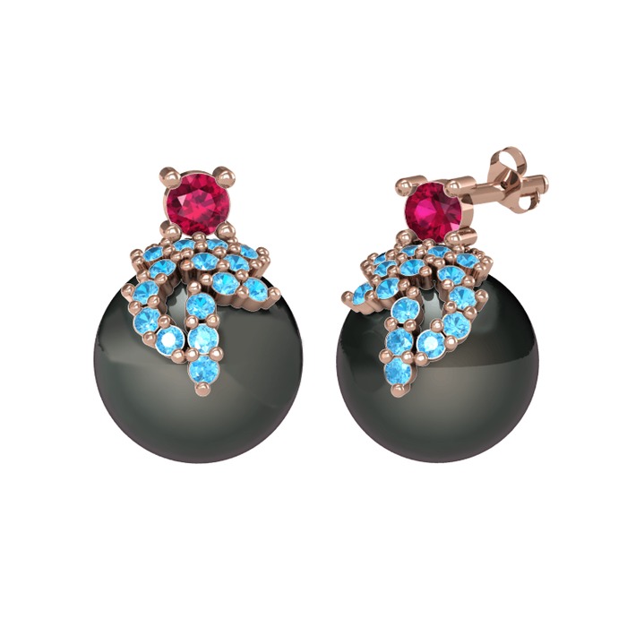 Rodolit garnet, akuamarin ve siyah inci 8 ayar rose altın küpe