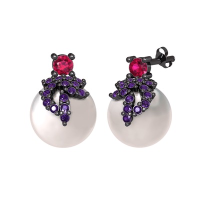Rodolit garnet, ametist ve inci 925 ayar siyah rodyum kaplama gümüş küpe