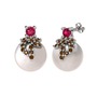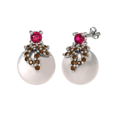 Rodolit garnet, dumanlı kuvars ve inci 18 ayar beyaz altın küpe