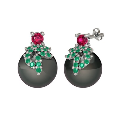 Rodolit garnet, kök zümrüt ve siyah inci 14 ayar beyaz altın küpe