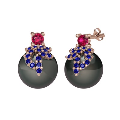 Rodolit garnet, lab safir ve siyah inci 18 ayar rose altın küpe