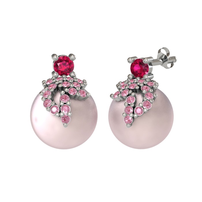 Rodolit garnet, pembe kuvars ve pembe inci 18 ayar beyaz altın küpe