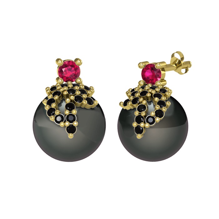 Rodolit garnet, siyah zirkon ve siyah inci 8 ayar altın küpe