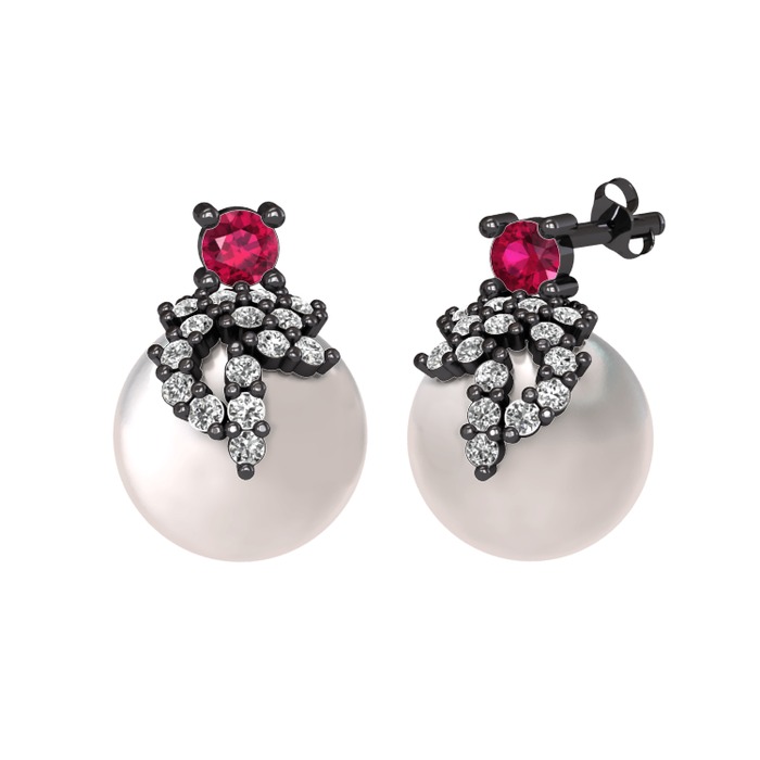 Rodolit garnet, swarovski ve inci 925 ayar siyah rodyum kaplama gümüş küpe