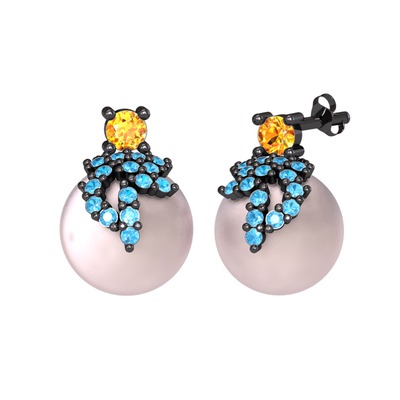 Sitrin, akuamarin ve pembe inci 925 ayar siyah rodyum kaplama gümüş küpe