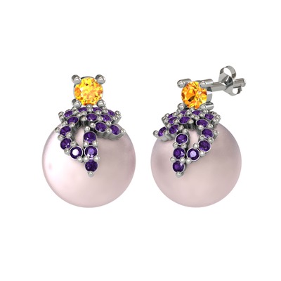Sitrin, ametist ve pembe inci 18 ayar beyaz altın küpe