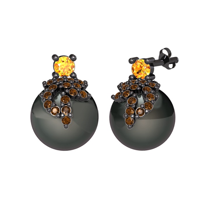 Sitrin, dumanlı kuvars ve siyah inci 925 ayar siyah rodyum kaplama gümüş küpe