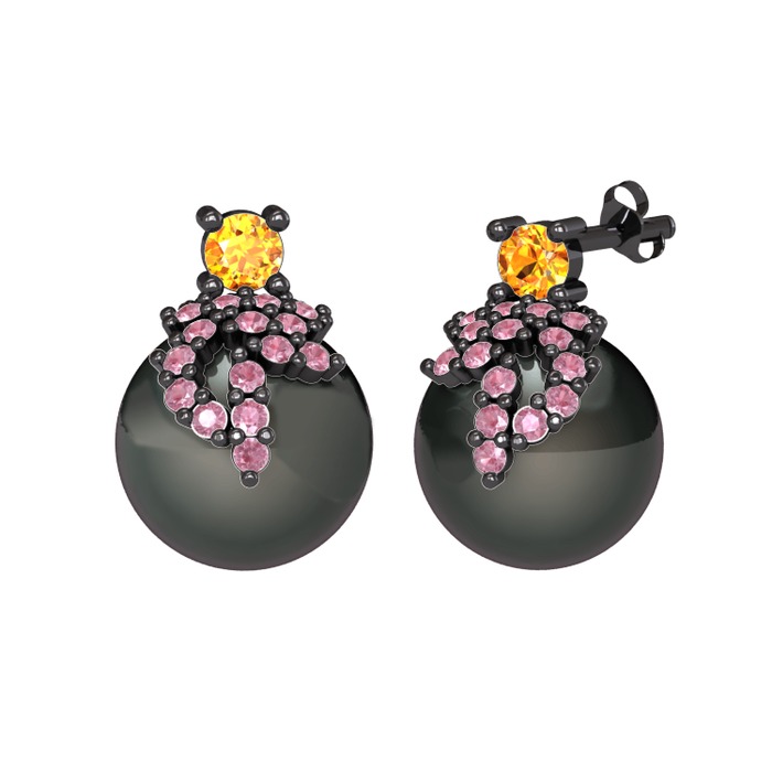 Sitrin, pembe kuvars ve siyah inci 925 ayar siyah rodyum kaplama gümüş küpe