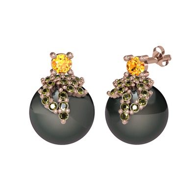 Sitrin, peridot ve siyah inci 8 ayar rose altın küpe