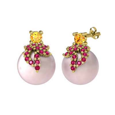 Sitrin, rodolit garnet ve pembe inci 8 ayar altın küpe