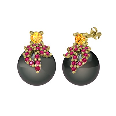 Sitrin, rodolit garnet ve siyah inci 14 ayar altın küpe