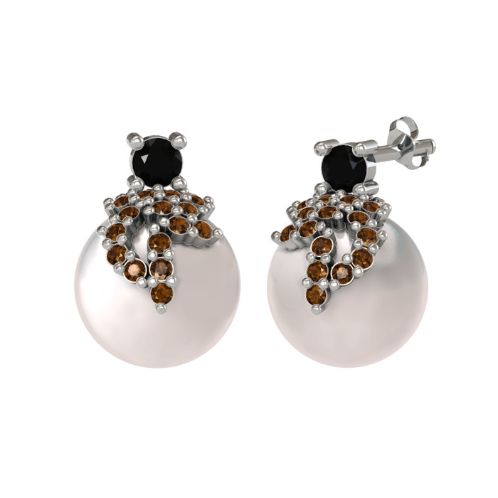 Siyah zirkon, dumanlı kuvars ve inci 18 ayar beyaz altın küpe