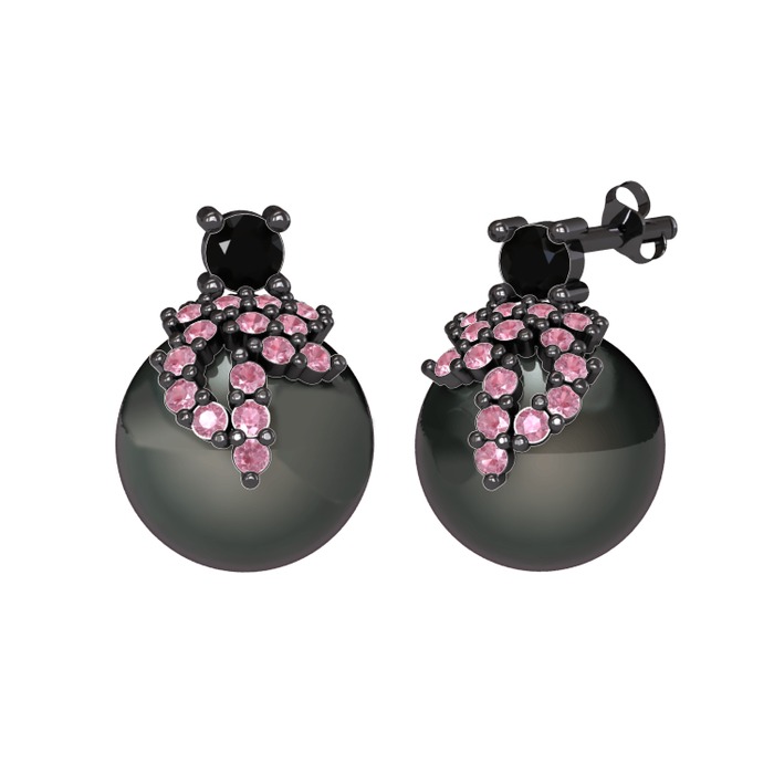 Siyah zirkon, pembe kuvars ve siyah inci 925 ayar siyah rodyum kaplama gümüş küpe