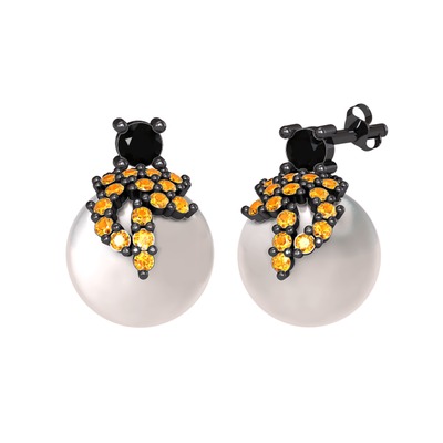 Siyah zirkon, sitrin ve inci 925 ayar siyah rodyum kaplama gümüş küpe