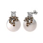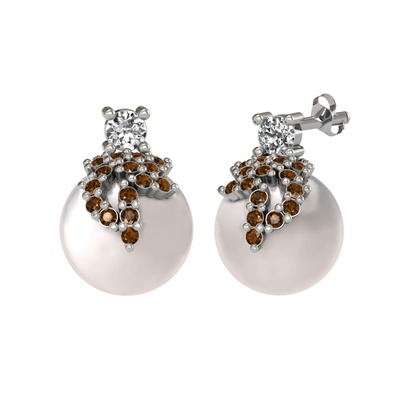 Swarovski, dumanlı kuvars ve inci 8 ayar beyaz altın küpe