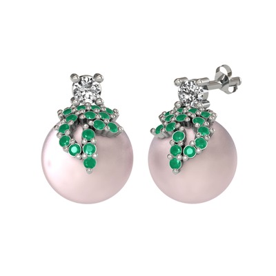 Swarovski, kök zümrüt ve pembe inci 14 ayar beyaz altın küpe
