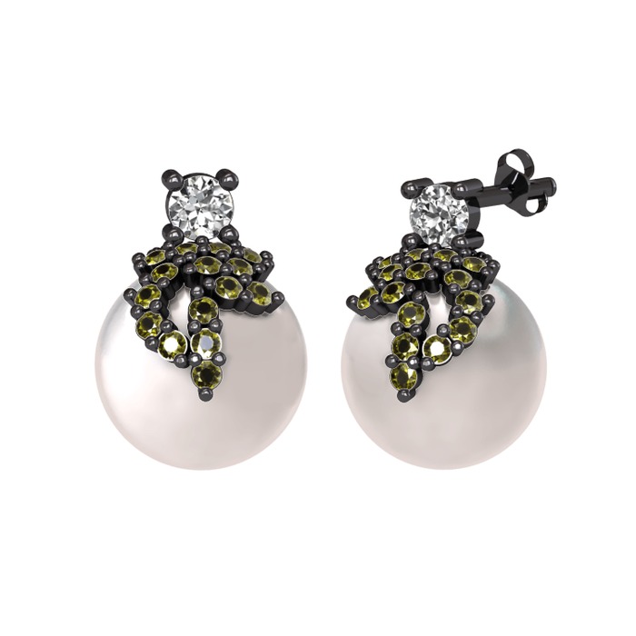Swarovski, peridot ve inci 925 ayar siyah rodyum kaplama gümüş küpe