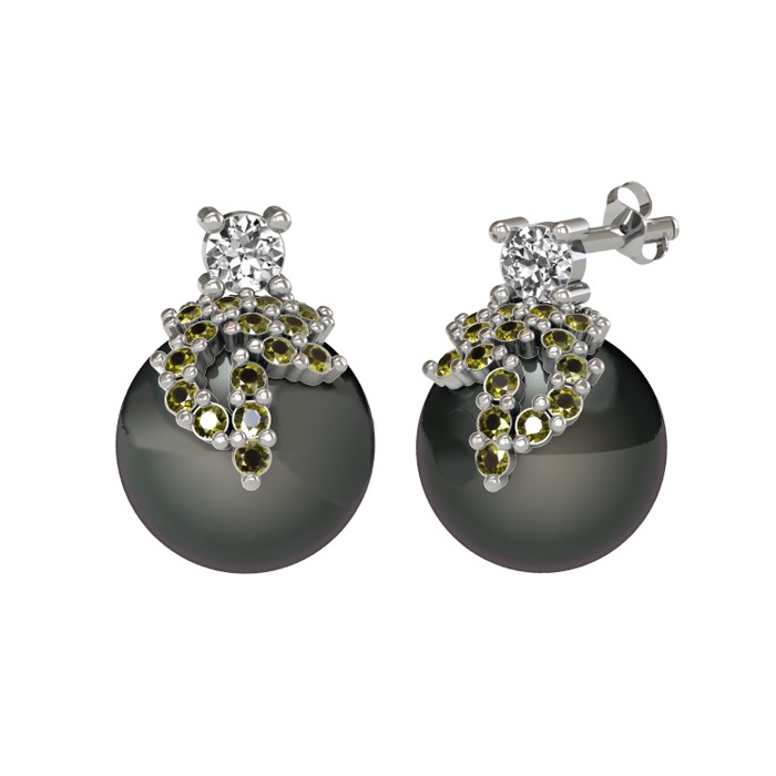 Swarovski, peridot ve siyah inci 14 ayar beyaz altın küpe