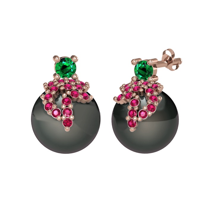 Yeşil kuvars, rodolit garnet ve siyah inci 8 ayar rose altın küpe