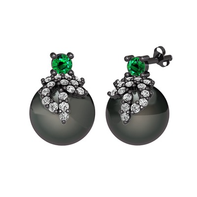 Yeşil kuvars, swarovski ve siyah inci 925 ayar siyah rodyum kaplama gümüş küpe