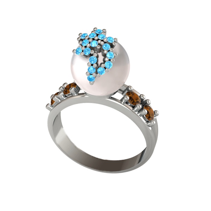 Inci, akuamarin ve dumanlı kuvars 8 ayar beyaz altın yüzük