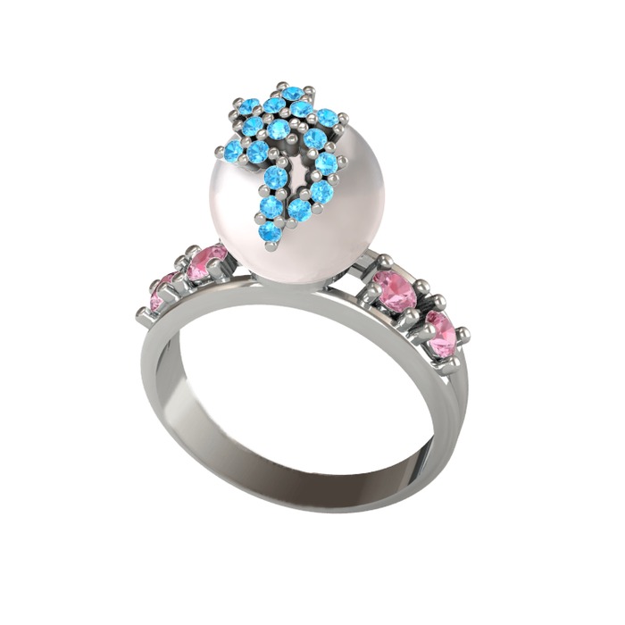 Inci, akuamarin ve pembe kuvars 8 ayar beyaz altın yüzük
