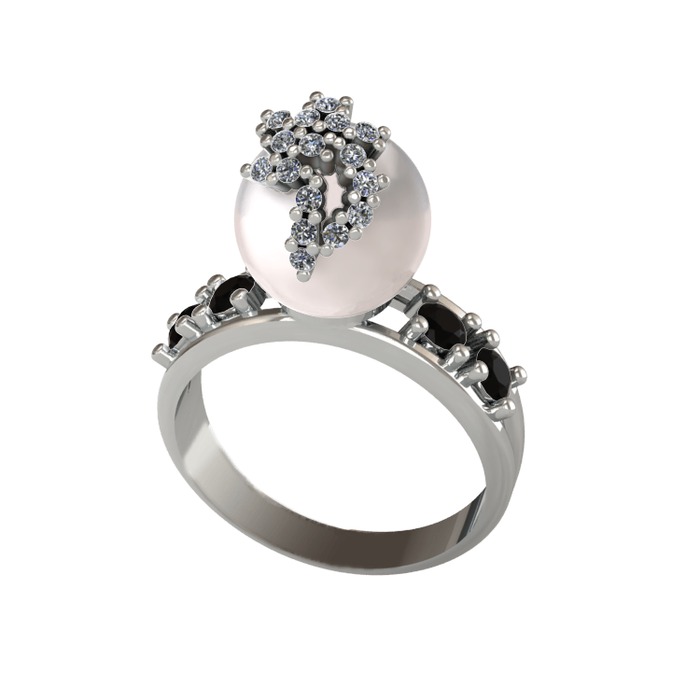 Inci, beyaz zirkon ve siyah zirkon 18 ayar beyaz altın yüzük