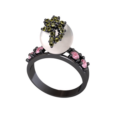 Inci, peridot ve pembe kuvars 925 ayar siyah rodyum kaplama gümüş yüzük