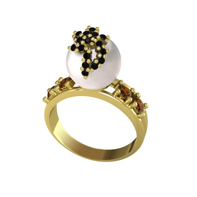 Inci, siyah zirkon ve dumanlı kuvars 14 ayar altın yüzük