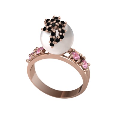 Inci, siyah zirkon ve pembe kuvars 14 ayar rose altın yüzük