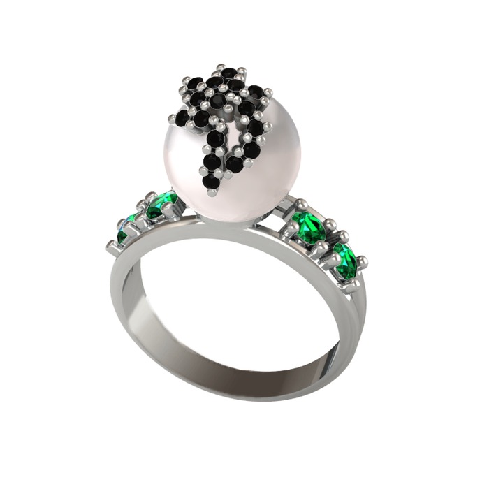 Inci, siyah zirkon ve yeşil kuvars 18 ayar beyaz altın yüzük