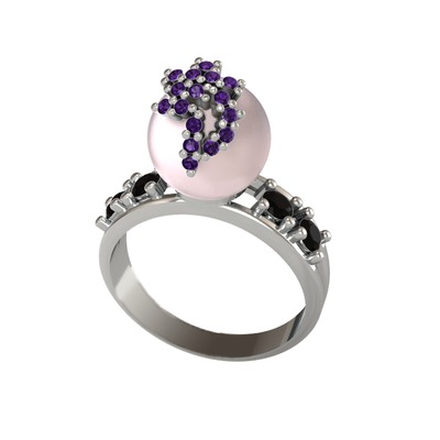 Pembe inci, ametist ve siyah zirkon 14 ayar beyaz altın yüzük