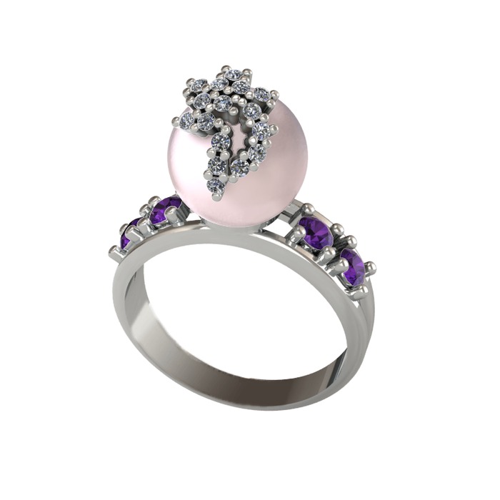 Pembe inci, pırlanta ve ametist 14 ayar beyaz altın yüzük (0.176 karat)