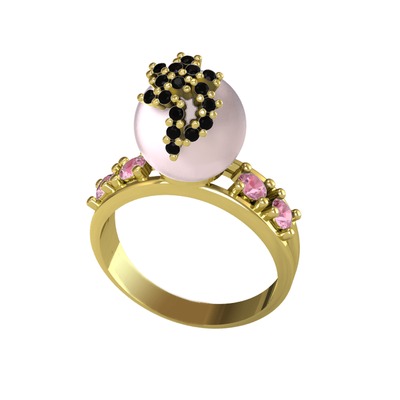 Pembe inci, siyah zirkon ve pembe kuvars 8 ayar altın yüzük