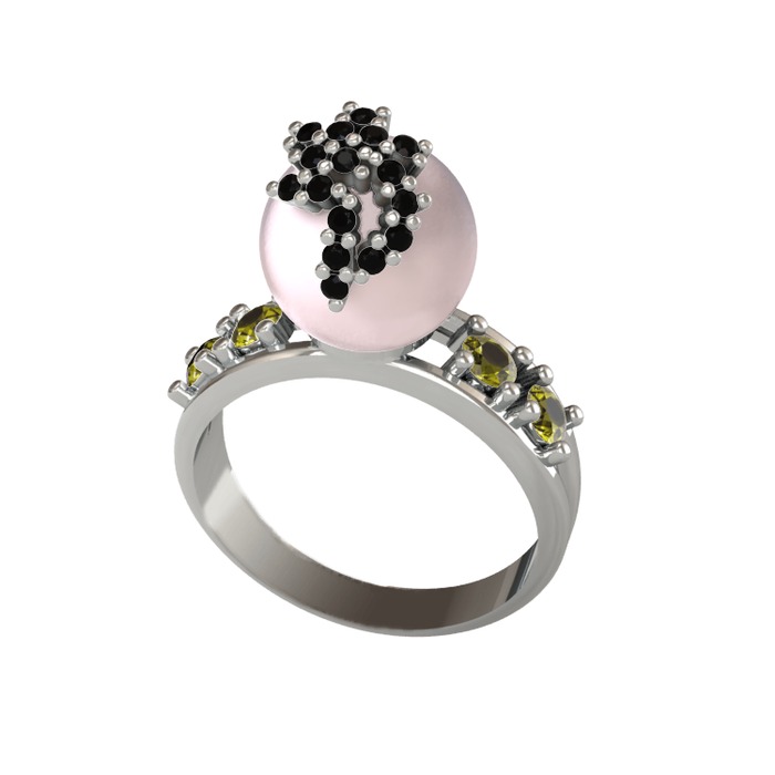 Pembe inci, siyah zirkon ve peridot 14 ayar beyaz altın yüzük