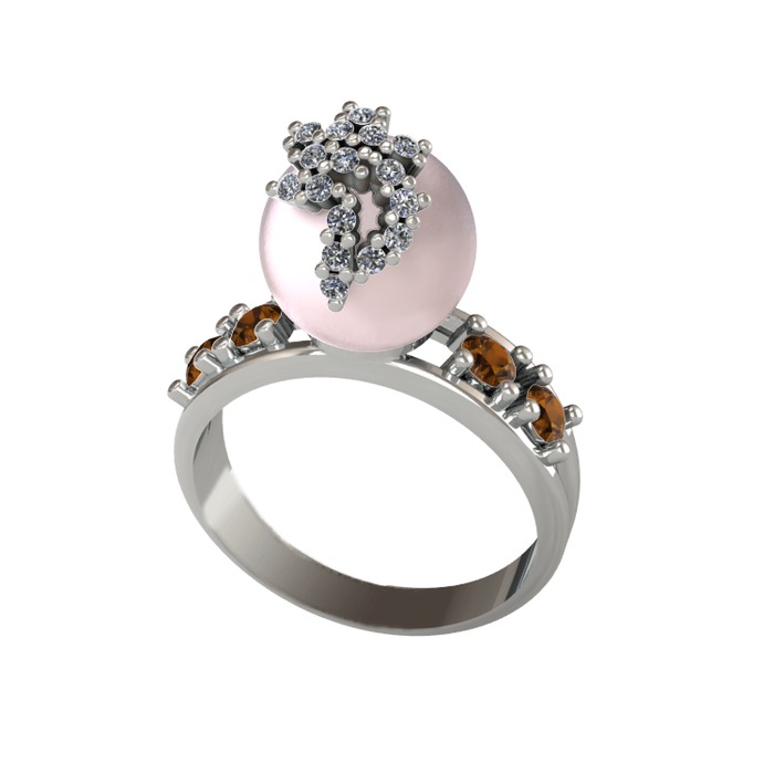 Pembe inci, swarovski ve dumanlı kuvars 8 ayar beyaz altın yüzük