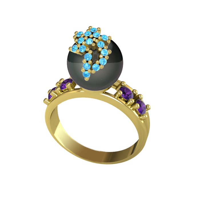 Siyah inci, akuamarin ve ametist 18 ayar altın yüzük